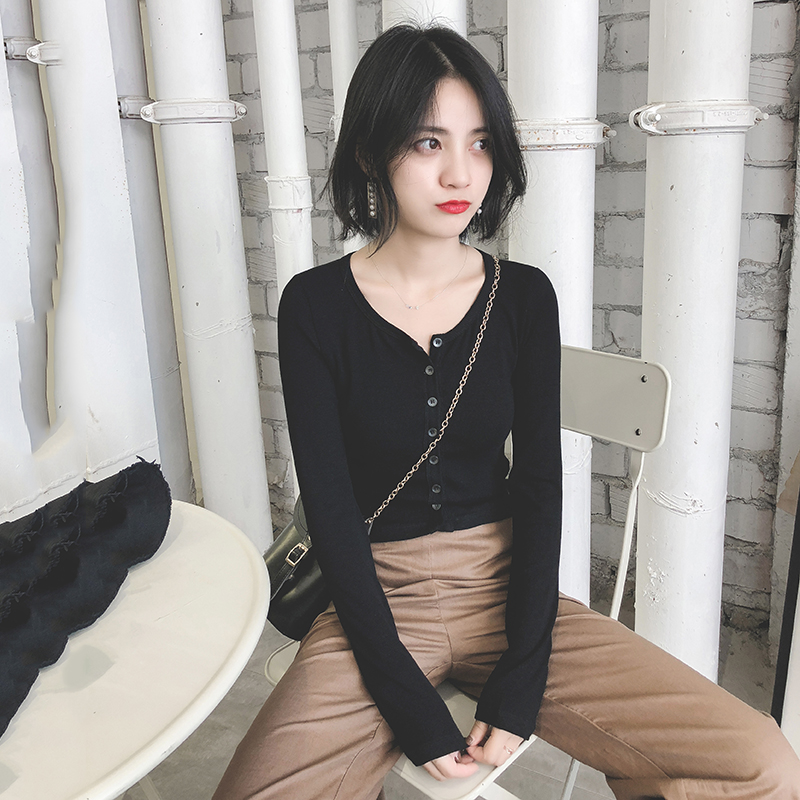 2018秋装新款韩版薄款修身针织衫女长袖开衫chic早秋初秋黑色上衣